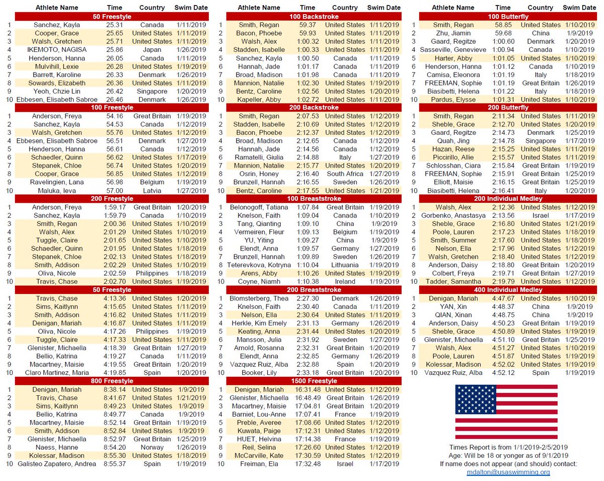 Below are the current Top 10 Female 18 & Under Swimmers in the WORLD, in each Individual Olympic event.