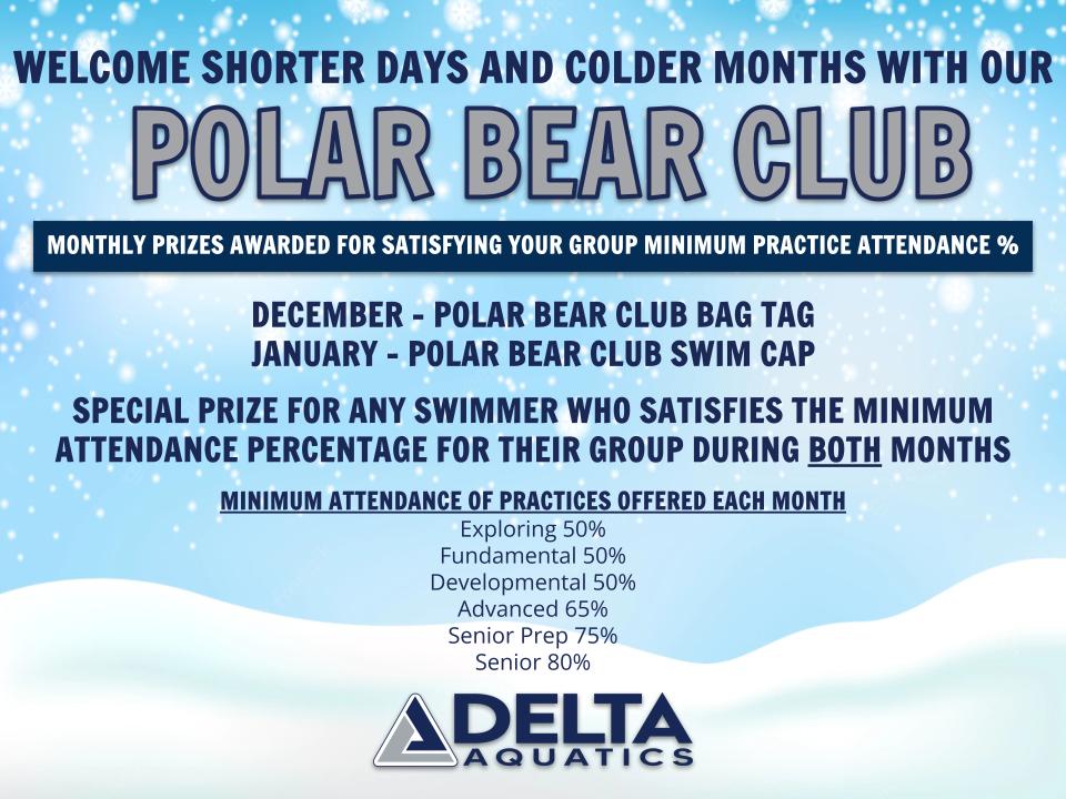 The Polar Bear Club is set up to help motivate swimmers to stay in the water through the winter months. All swimmers have the same goal to meet the minimum practice attendance for their group per month in December and January. Swimmers will be awarded for meeting their goals (see below flyer for group requirements and details). At the end of each month, swimmers will receive a special award.